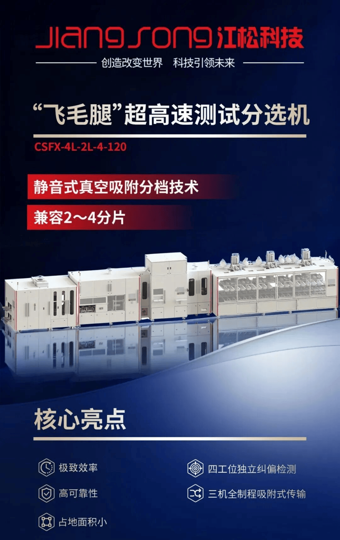 江松科技以“前沿手艺+先辈工艺”为焦点,建立了光学视觉检测、高精度图像处置、、高不变性传感定位、高速活动机构节制、自研软件运算阐发等焦点手艺系统,特别正在N型手艺取多分片范畴构成差同化劣势。针对TOPCon、XBC、HJT等工艺需求,率先开辟适配TOPCon的搬舟布局和小舟定位平台,处理高速出产碎片率难题;从力机型JS-7000M/7500H适配210三分片/四分片,兼容120-200μm薄片,AI视觉+动态吸盘节制实现碎片率≤0。04%,焊带切换时间<30min,电池切换<2h。截至2024年,公司累计具有161项专利,研发的210mm硅片扩散退火从动化设备产能达13500片/小时,PECVD设备产能提拔至8500片/小时,机能远超国表里同类产物。同时,公司还结构了硼扩散设备、LPCVD、清洗设备等电池片焦点工艺设备,以及串焊机、贴膜机等组件端环节设备,做为国内少数能供给光伏电池整线一体化处理方案的厂商,江松科技2022年光伏电池从动化设备范畴国内及全球市场拥有率均居首位,并位列《2022-2023年中国光伏财产年度演讲》代表厂商第一位。2023年全球光伏电池产量前十企业(均为中国企业,占全球产量70。9%)全数为公司客户,笼盖通威股份、隆基绿能、晶澳科技、天合光能等一线厂商。公司成立“协同迭代开辟”机制,取下逛厂商结合推进手艺升级,荣获“协同立异”“最佳合做”等称号。海外市场方面,产物已出口至新兴光伏产区,凭仗“高效+低碎片+整线联动”劣势打建国际市场。2022-2024年,公司停业收入从8。07亿元增至20。19亿元,停业收入复合增加率达58。15%,2024岁暮正在手订单36。13亿元,持续运营能力行业领先,客户粘性取市场份额构成双沉护城河。江松科技拟正在创业板上市,打算募集10。53亿元用于光伏智能配备出产扶植(拓展硼扩散设备、LPCVD等电池片工艺设备)、研发核心升级(强化N型手艺储蓄)、聪慧运营平台搭建(提拔设备智能化程度)、宿迁智能配备细密机械加工扩建及弥补流动资金。募资后将构成“电池片工艺设备+组件端设备”双线结构,依托现有从动化设备劣势切入光伏电池焦点工艺范畴,估计产能扩张后将进一步巩固全球市场地位。截至2024年,公司通过子公司江松能源、宿迁江松等结构四大出产,建立起笼盖研发、出产、近两年公司手艺立异显著:2026年1月,正式发布“飞毛腿”超高速测试分选机(CSFX-4L-2L-4-120),集成正背颜色检测、IV/EL/PL检测,支撑2-4片同时测试,适配TOPCON/BC工艺的高速分档需求;2025年12月,取得“边框规整拆卸机构”专利(CN223617605U),通过从动化调整光伏板边框,缩短机械节奏提拔出产效率;2024年10月,子公司无锡松拓交付二代超大产能光伏电池湿法清洗设备,产能≥18000片/小时,合用于光伏TOPCON、XBC、HJT等电池工艺,尺寸兼容方片、矩形片及半片工艺,降低化学品单耗取能耗,为N型电池大规模量产供给环节设备支持。